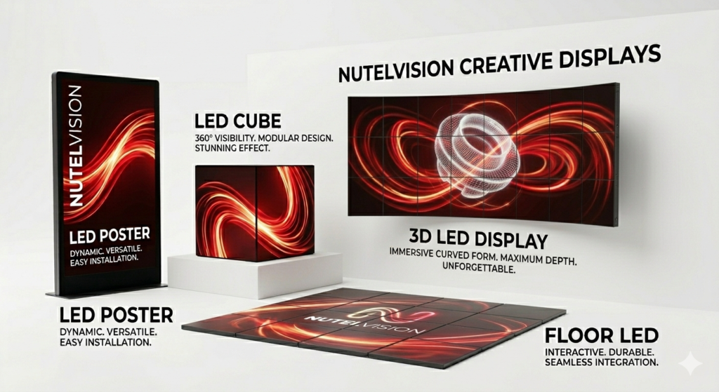 Dominate the visual landscape with NutelVision’s ultra-bright and versatile creative displays. Our screens deliver vibrant, high-contrast imagery that commands attention, offering unique forms from curved architectural walls to interactive digital floors.