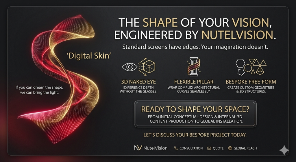 Why fit your vision into a rectangle when the world isn’t flat? NutelVision’s Free-Form LED series is designed for architects, designers, and visionaries who refuse to be contained by standard screen ratios. We transform structural challenges into digital masterpieces.